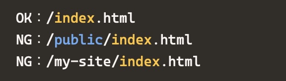 この状態だと、GitHub Pages は index.html を見つけられません。